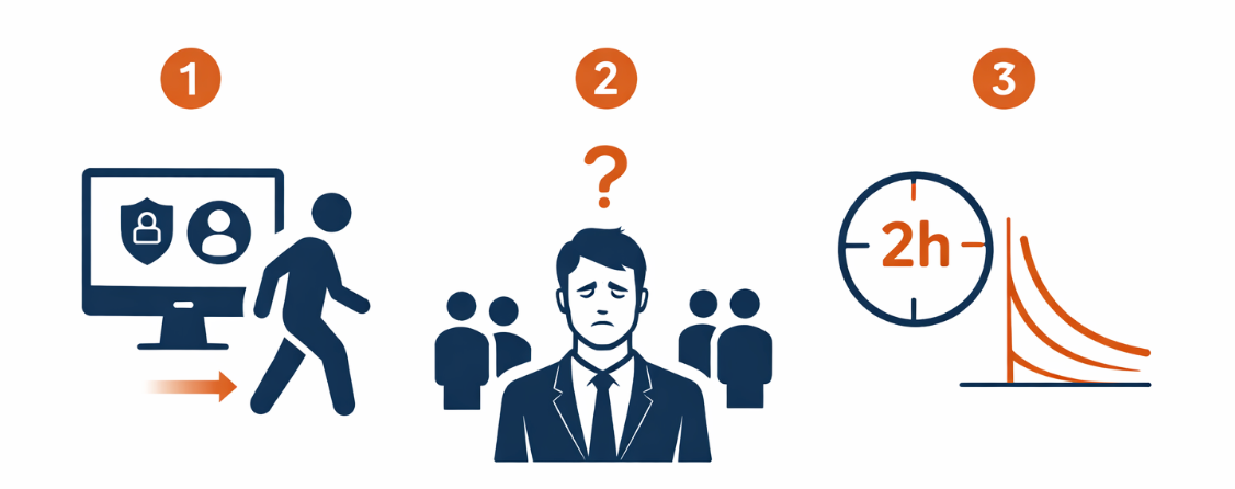 Training sessions arrive after deployment, last two hours, and are delivered by IT teams who don't speak the business language. Employees leave with internal certifications they can't translate into daily usage.