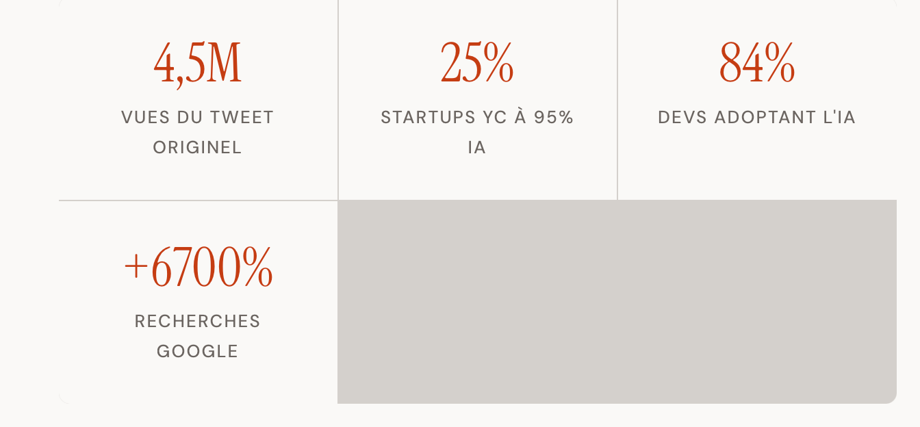 What is striking about the genesis of vibe coding is the speed of cultural shift. In march 2025, Y Combinator reported that 25% of startups in its winter cohort had codebases generated 95% by IA. By November 2025, 84% of developers were using or planning to use AI coding tools (Stack Overflow Developer Survey 2025). The Google search curve for "vibe coding" jumped 6700% in spring 2025.