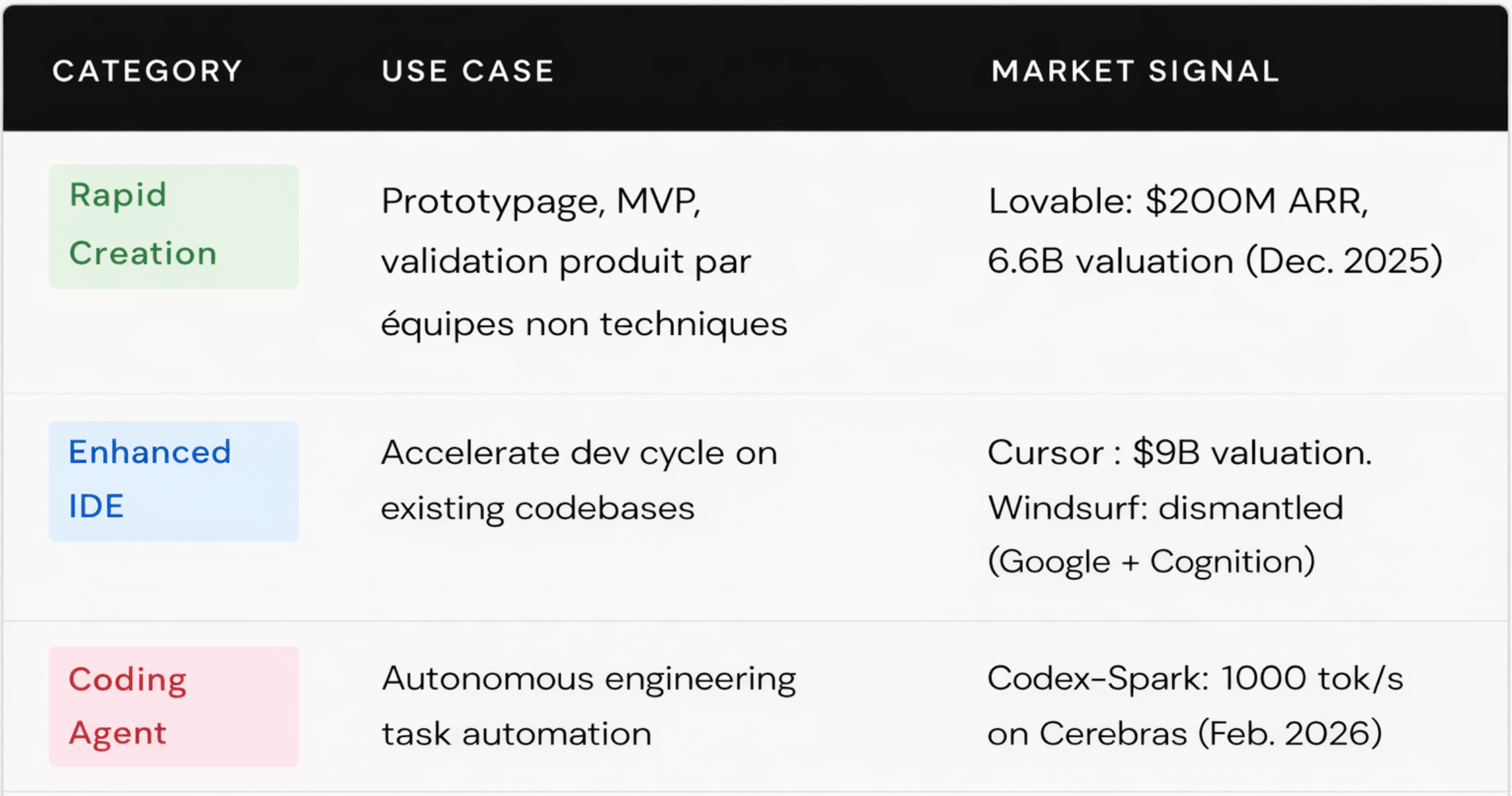 Cursor, Windsurf/Cognition, GitHub Copilot target professional developers. Cursor raised $900M at a $9B in May 2025. The Windsurf affair illustrates the competitive intensity of the sector : after an attempted $3B acquisition by OpenAI fell in July 2025. Blocked by the conflit of interest with Microsoft. Google DeepMind recruited the CEO and co-fonder for $2,4B, while Cognition AI acquired the remaining assets (Fortune, Bloomberg, TechCrunch).