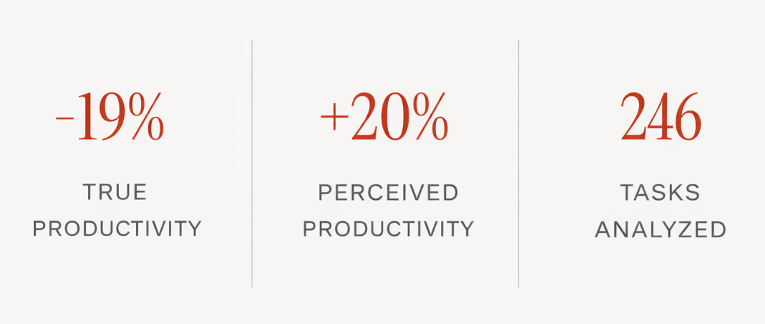 The most striking study of 2025 comes from METR, a non-profit research organization. Their randomized controlled trial of 16 experienced developers, 246 reals tasks in matures open-source projects produced a counterintuitive result : developers are using AI tools (primarily Cursor Pro with Claude 3.5/3.7 Sonnet) took 19% longer to complete their tasks than those working without IA (METR, arXiv:2507.09089, July 2025).